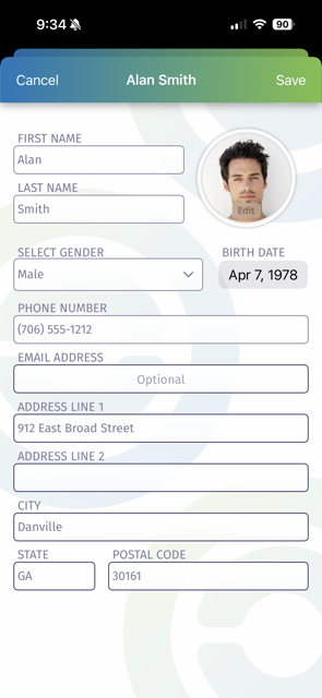 You can edit any of the information shown on this form. Tapping Cancel will exit without saving any changes, while tapping Save will update your account information before returning to the prior screen.