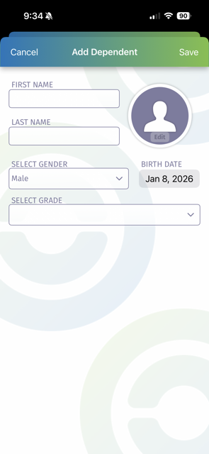 Enter the details about your dependent and add a photo if desired. When you're done, tap the Save button to create the new dependent. Or, if you have changed your mind, you can tap the Cancel button to exit without creating the new dependent.