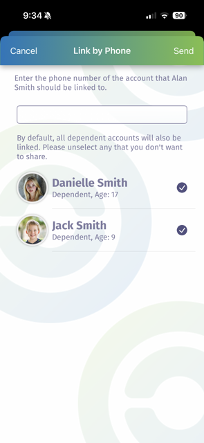 Enter the phone number of the member that you want to link your account to and indicate (via checkbox) if you also want to share any dependents on your account.