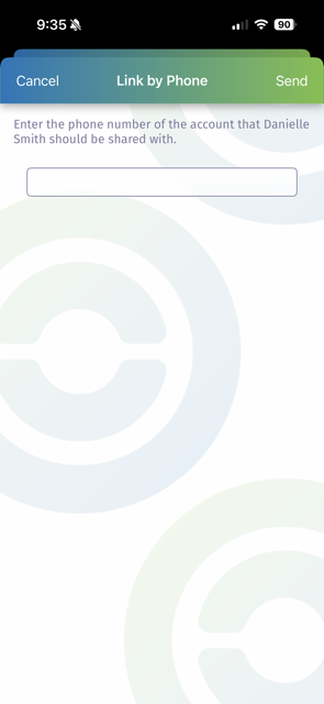 Enter the phone number for the account member that you want to share the dependent with and tap the Send button. Or, if you've changed your mind, tap the Cancel button to exit without sharing.