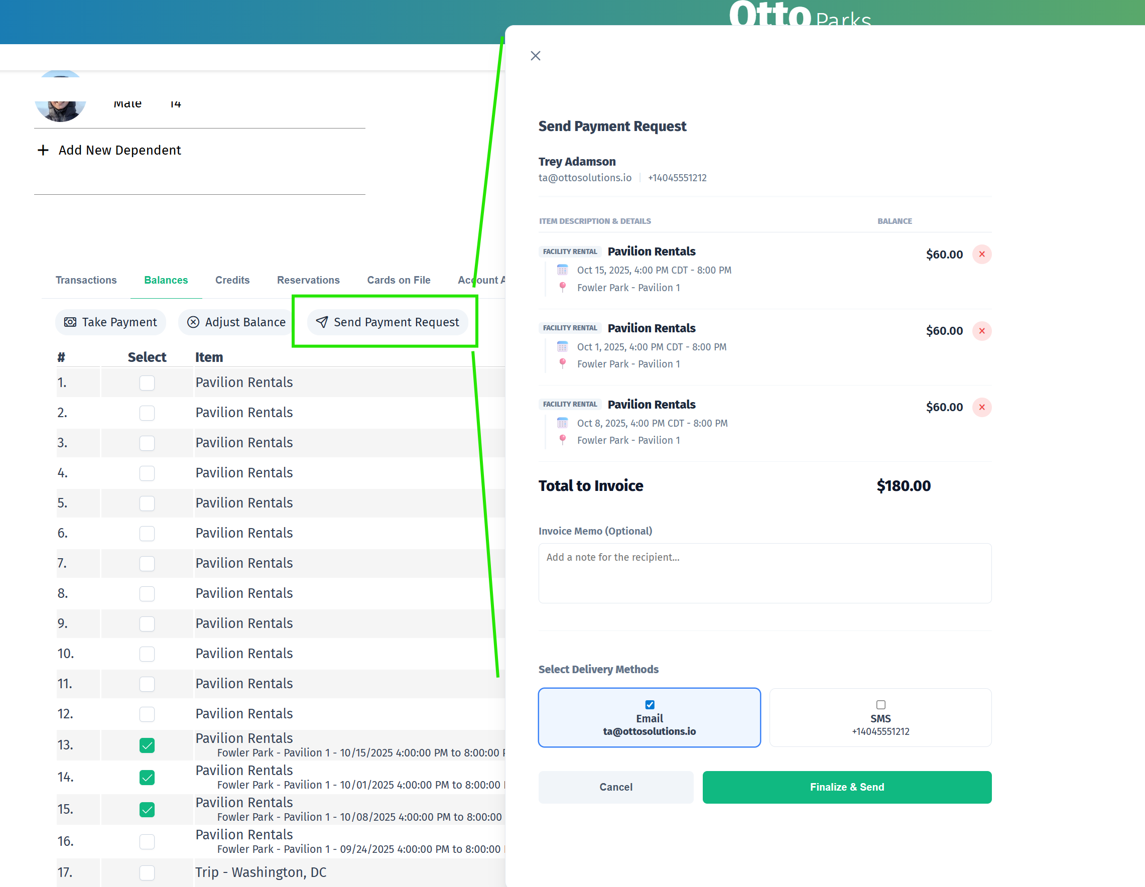 Staff have the ability to send payment requests to participants via sms or email. The recipient will receive a link that does not require login, but will allow the participant to click and make a quick payment on any balance due.