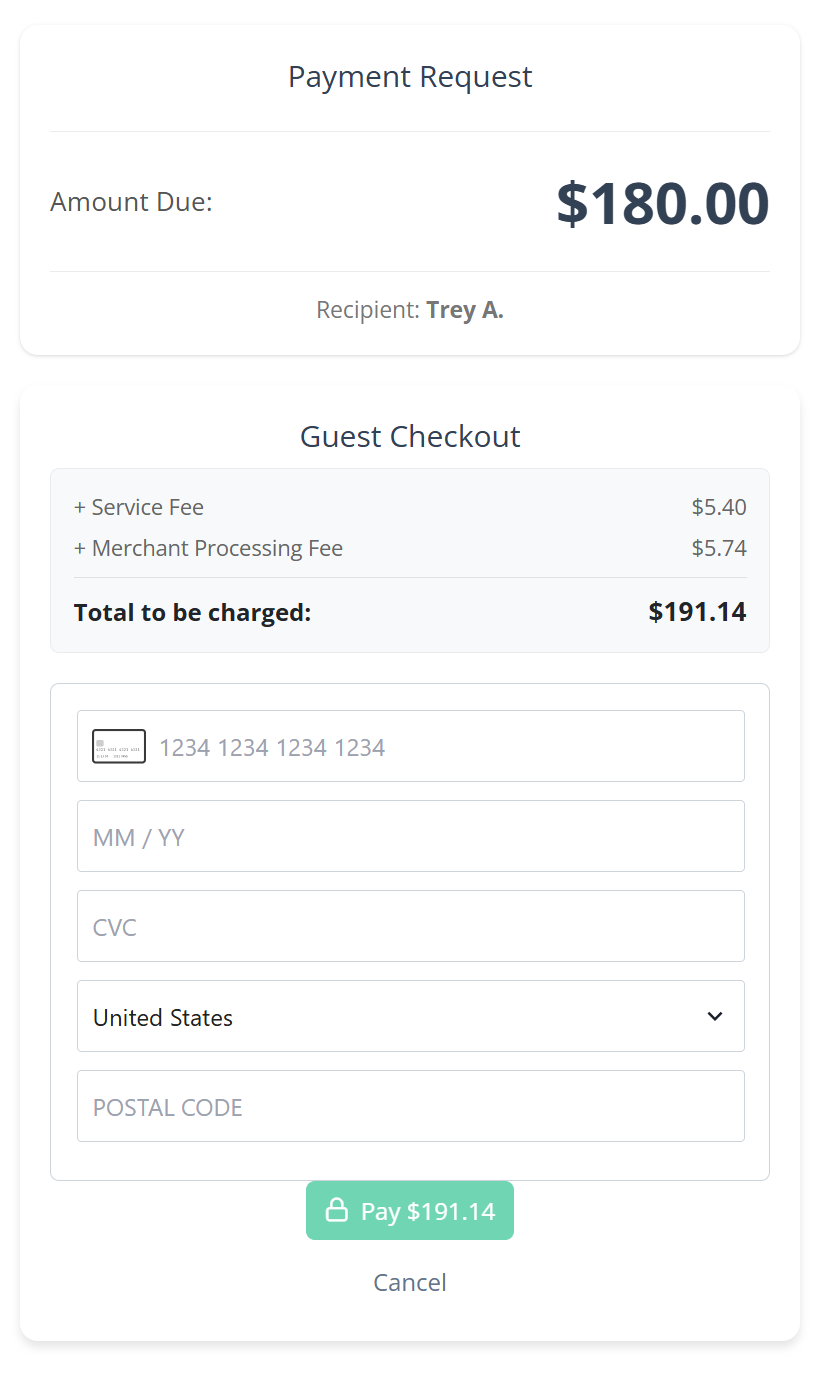 The recipient will receive a simple payment form that will display appropriately for either a desktop browser or phone. They simply enter their credit card info and submit.